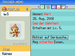 Auf der zweiten Seite des Pokémon-Menüs kann man, direkt über der Information was das Pokémon gerne isst, einen DV-Spruch sehen. Die meisten wissen nicht, was es damit auf sich hat, aber er kann einem helfen, wenn man die Bedeutung der Sprüche kennt. Diese deuten nämlich darauf hin, dass der jeweilige Statuswert den höchsten DV-Wert des Pokemon haben kann. Der DV-Spruch ist lediglich ein Hinweis auf die maximale Höhe des Statuswertes, jedoch keine genaue Angabe.| DV-Spruch von Panflam |