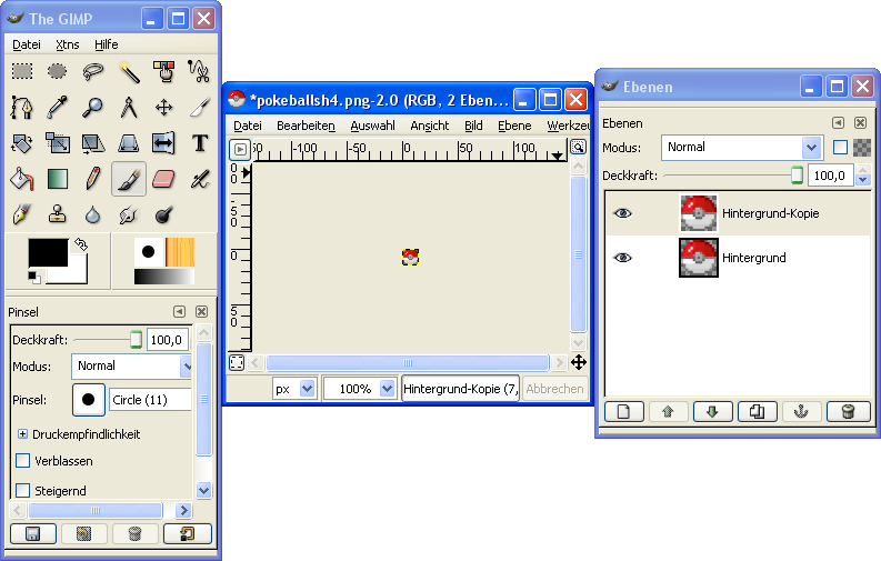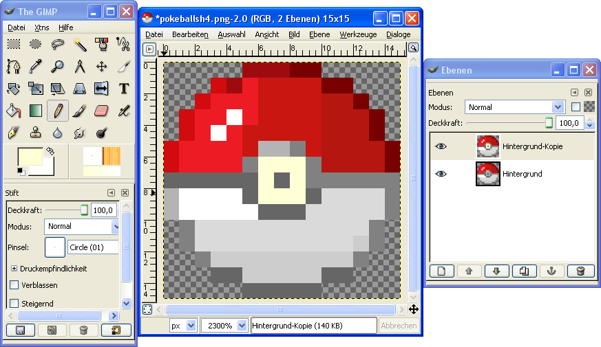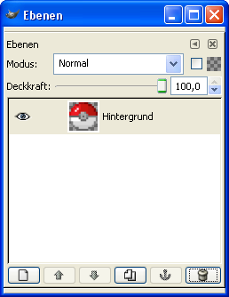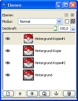 Klickt im "The GIMP"-Fenster auf Datei -> Dialoge -> Ebenen (oder drückt STRG-L). Ihr bekommt ein drittes Fenster angezeigt, das sogenannte Ebenenfenster. Ebenen könnt ihr euch als Folien vorstellen, die übereinandergelegt werden. Jede kann ein anderes Bild enthalten und ihr könnt jede unabhängig von den anderen bearbeiten. Wenn ihr mit The GIMP eine Animation erstellen möchtet, betrachtet das Programm jede Ebene als einzelnen Frame. Mehrere Ebenen bedeuten also mehrere Frames - und damit eine Animation.Das wollen wir jetzt ausprobieren und lassen den Druckknopf unseres Pokéballs blinken. Damit wir nicht den ganzen Pokéball neu zeichnen müssen, verdoppeln wir einfach die Pokéball-Ebene und führen auf der neu entstandenen Ebene die Änderungen durch, die wir haben möchten. Im Moment sieht euer Ebenenfenster so aus: