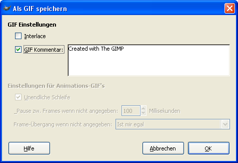 GIMP zeigt euch nun das allerletzte Menü, das ihr überwinden müsst, um eure Animation fertig zu stellen. Beim "GIF-Kommentar" könnt ihr irgendeine Beschreibung eingeben, wenn ihr Lust habt. Wichtig für uns ist nur noch die Option "Unendliche Schleife". Ist sie aktiviert, wird die Animation unendlich lange abgespielt, ist sie deaktiviert, endet die Animation nach einem Durchgang. Für unseren Zweck sollte dies also aktiviert sein. Klickt auf "OK".