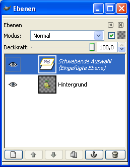 Beide Bilder müssen nun in einer einzigen Datei, auf zwei Ebenen verteilt, zusammengebracht werden. Klickt dafür euer zweites Bild an und drückt die Tastenkombination STRG+A (Alternativ über das Menü: Auswahl -> Alles). Damit wählt ihr das komplette Bild aus. So weiß GIMP, dass ihr mit dieser Auswahl gleich etwas anstellen wollt.Nun kopieren wir unsere Auswahl in die Zwischenablage des Rechners. Dazu drücken wir STRG+C (Alternativ: Bearbeiten -> Kopieren). Klickt jetzt das erste Bild an und drückt, wenn es aktiv ist, die Tastenkombi STRG+V (Alternativ: Bearbeiten -> Einfügen). So fügt ihr die eben erstellte und kopierte Auswahl in das Bild ein. Ihr seht, dass eine neue Ebene mit dem Namen "Schwebende Auswahl (Eingefügte Ebene)" entstanden ist.