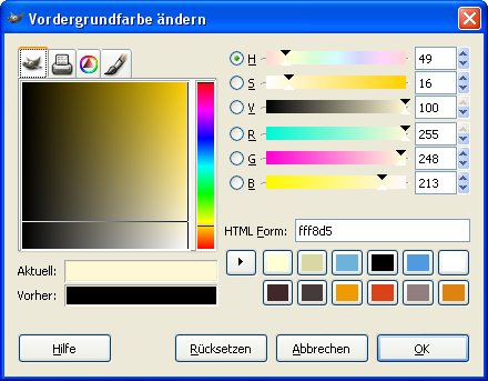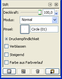 Jetzt suchen wir uns das Bleistift-Werkzeug heraus, mit dem wir das Blinken einzeichnen werden. Dieses befindet sich im "The GIMP"-Fenster. Unterhalb findet ihr mehrere Einstellmöglichkeiten, die für uns wichtig sind. Zum Einen das Feld für Vorder- und Hintergrundfarbe...