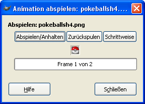 Jetzt wollen wir testen, wie unsere Animation aussieht. Das können wir, ohne die Datei extra abspeichern und irgendwo anders öffnen zu müssen. Klickt dazu in eurem Pokéballfenster auf Filter -> Animation -> Animation abspielen. Folgendes Fenster öffnet sich: