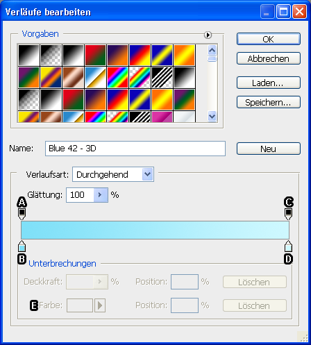 Ein guter Verlauf ist die Grundlage einer guten Webgrafik. Deshalb ist es wichtig den genauen Umgang mit ihnen zu kennen. Viel Spaß beim folgenden Tutorial.1.1 Das Verläufe bearbeiten-Fenster