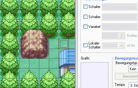 In dieser Ebene kann man Charaktere und andere Sachen auf der Map platzieren. Klickt man also auf Symbol “4“, gelangt man auf die Ereignisebene und die Map wird gerastert. Für jedes Raster kann man ein Ereignis (auch genannt Event) festlegen. Dazu ist nur ein Doppelklick auf die gewünschte Position nötig. So gelangt man ins Event-Menü.