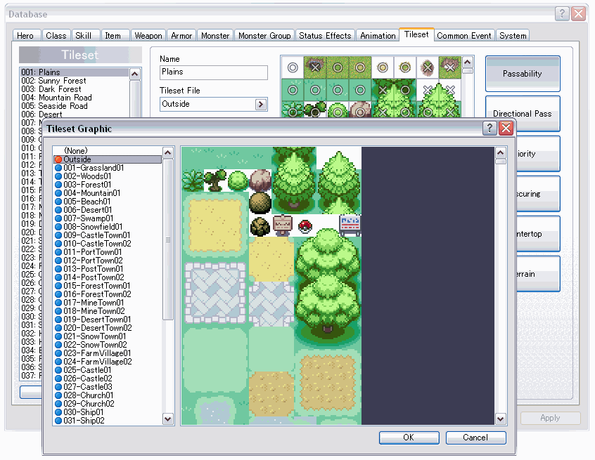 Wenn ihr nun auf OK klickt ist das Tileset importiert und ihr könnt es in der Database auswählen! Genauso wie Tilesets könnt ihr auch Autotilesets importieren.