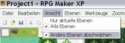 Wenn du eine Map veröffentlichen willst, sollten natürlich alle Ebenen voll zur Geltung kommen. Das geht zwar auf der Ereignisebene, allerdings haben wir dort die Map gerastert und das ist nicht sehr schön anzusehen! Deshalb geht oben in der Standart-Menüleiste auf "Ansicht" und nehmt den Haken von "Andere Ebenen abschwächen" weg. Jetzt sind alle Ebenen voll sichtbar und ihr könnt einen Screen von eurer Map machen.