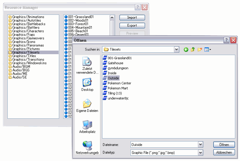 Der Ressourcenmanager erlaubt es dir deine eigenen Ressourcen zum Mappen zu verwenden, also nicht nur die Standart Tilesets. Um ein eigenes Tileset zu importieren wählt man den entsprechenden Ordner "Graphics/Tilesets", dann den Button "Import". Anschließend wählt man den Pfad aus, auf dem das Tileset zu finden ist.
