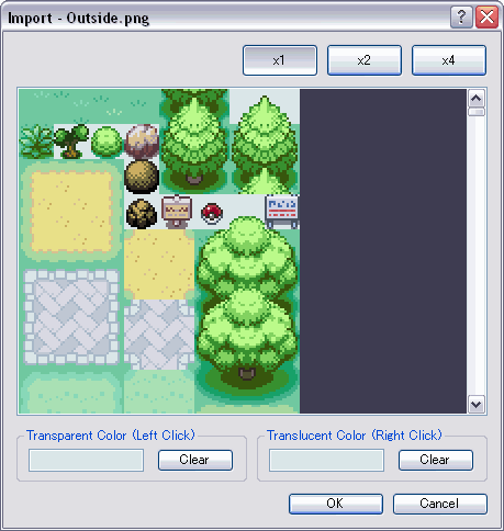 Es öffnet sich ein Vorschau-Fenster mit dem entsprechenden Tileset: NUR hier könnt ihr die Transparenz und die Lichtdurchlässigkeit für euer Tileset einstellen. Farben die später nicht zu sehen sein sollen wählt ihr mit einem Linksklick aus, Farben die später lichtdurchlässig sein sollen mit einem Rechtsklick.