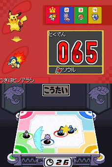 Kategorien: Kraft, TempoBei diesem Spiel befinden sich mehrere Kreise auf dem Spielfeld. Bewege deine Pokémon mit Hilfe des Stylus in die jeweiligen Kreise, um Punkte zu kassieren. Gewinner ist der Spieler, der am Ende der Zeit die meisten Pokémon in den höherwertigen Kreisen stehen hat. Obwohl es einfach klingt, sollte das Spiel aber nicht unterschätzt werden. Da du selbst drei Pokémon kontrollierst, sind noch weitere neun Gegner auf dem Feld, die du versuchen solltest wegzustoßen. Zudem geben kleine Kreise mehr Punkte als die Großen.