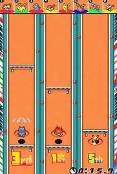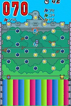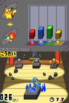 Kategorien: Technik, SprungDieses Spiel wurde uns als zweite Herausforderung demonstriert. Auch hier kommt erneut der Touch-Screen in seinem vollen Ausmaß zum Einsatz. Während des Spiels musst du das Sprungtuch mit dem Stylus in Bewegung versetzen, so dass die Pokémon nach oben springen können. Dabei geht es darum, dass du es während des Zeitlimits schaffst, so viele Lichter wie nur möglich auszuschalten. Setze deine drei Pokémon geschickt an drei unterschiedlichen Positionen ein, um viele Lichter zu erwischen.