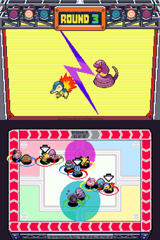 Kategorien: Kraft, AusdauerWie bei einem Kampf in einem Ring zu erwarten, müssen die Pokémon sich gegenseitig aus dem Ring befördern. Der Kampfring hat dabei keine Abgrenzungen, weshalb die Pokémon, wenn sie mit genug Kraft getroffen werden, einfach aus dem Ring fallen. Das eigene Pokémon, das sich zwischen den drei Gegner im Kampf befindet, wird mit dem Stylus gegen die anderen geschleudert. Achte darauf, wie viel Kraft du in den Treffer investierst und dass du den Gegner wirklich erwischst. Bis die Uhr 0 erreicht, werden immer neue Pokémon in den Ring steigen, wenn du ein anderes hinausbefördert hast.