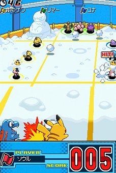 Kategorien: Kraft, TechnikDer Name sagt eigentlich schon alles zum Spiel: Die Pokémon werden eine Schneeballschlacht austragen. Hierbei treten deine drei Pokémon gegen alle anderen gegnerischen Pokémon an. Kontrolliert wird das Spielgeschehen durch das Werfen von Schneebällen auf die drei gegnerischen Teams, die sich sowohl vor dir, als auch rechts und links neben dir befinden. Kontrolliert wird das Geschehen natürlich über den Touchscreen. Der Wurf muss möglichst präzise sein, damit du das Pokémon auch triffst und Treffer geben nun mal Punkte. Auch die Distanz, die die Pokémon zueinander haben, spielt eine Rolle bei der Kraft, die der Wurf hat. Wurde jemand getroffen, so wird die Bewegung des Pokémon für eine Weile eingeschränkt und es kann keine Schneebälle werfen.