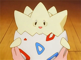Am 28. Mai 1998 tat Nintendo einen weiteren Schritt in Richtung „Werbung durch die Blume“ und ließ im Pokémon-Anime in der Folge Attack of the Prehistoric Pokémon ein seltsames, rot-blau gemustertes Ei auftauchen, von dem keiner so richtig wusste, wo es hingehörte oder was sich in ihm befand. Einen Monat später, am 25. Juni, in der Folge Who gets to keep Togepi, schlüpfte ein bis dahin unbekanntes Pokémon aus dem Ei: Die Nr. 175, Togepi.![]() | ![]() |