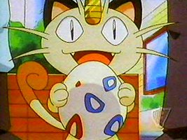 | Mauzi mit Togepis Ei. | Togepi ist geschlüpft. |