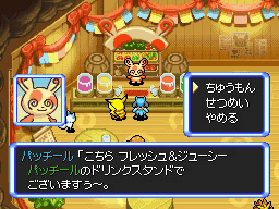 Spinda's Café Near the exit of Treasure Town is the new building; Spinda's Café. This café has two new stores and gives you access to the Unexplored Land once you reach a certain point in the game. At Spinda's Drink Stand, you have the ability of turning your Apples, Seeds & Berries into Drinks for a small price. These new items, which will have different effects, can then be utilised in Dungeons much like any other item. |