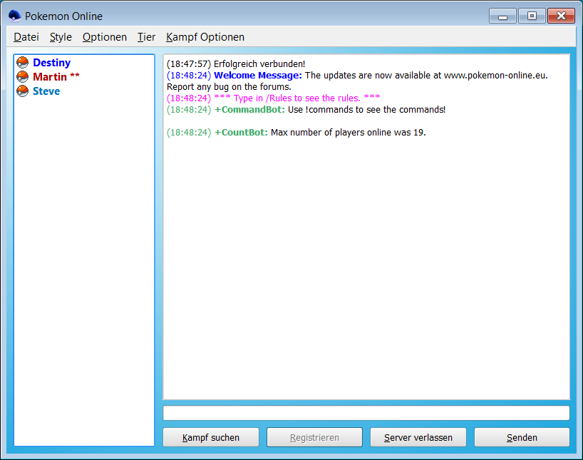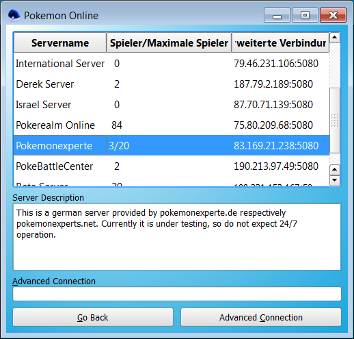 In der ersten Spalte siehst du den Namen des Servers, zum Beispiel den von uns betriebenen deutschen Server "Pokemonexperte", wo du auch auf Deutsch chatten darfst, was andernorts meistens verboten ist. Die zweite Spalte gibt an, wie viele Benutzer sich gerade auf dem Server befinden und in manchen Fällen auch die maximal erlaubte Anzahl an gleichzeitig eingeloggten Spielern, wenn diese nicht unbegrenzt ist. Der momentan bestbesuchte Server ist normalerweise der "Beta Server", der von den Entwicklern betrieben wird. In der dritten Spalte siehst du außerdem die IP-Adresse und den Port des Servers - mit dieser Information kannst du dich über die "Advanced Connection" auch dann einloggen, wenn die Registry down und die Serverliste damit nicht verfügbar ist. Mit einem Doppelklick auf die Zeile des gewünschten Servers wird die Verbindung aufgebaut.