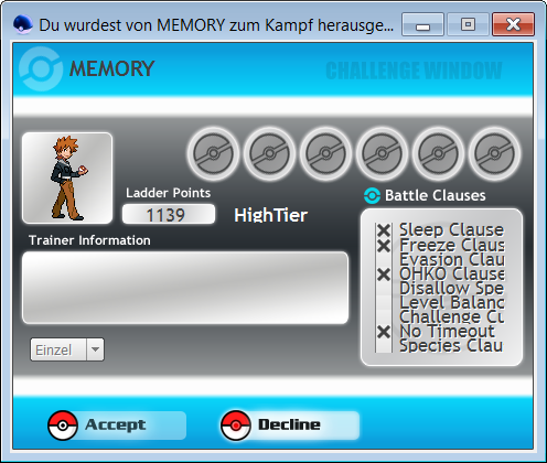 Challenge Cup | Beiden Spielern werden Teams mit zufälligen Pokémon zugelost. Entspricht der aus Shoddy Battle bekannten "Random Clause". |
