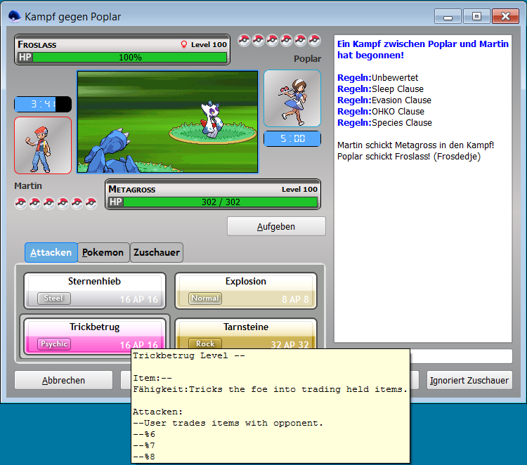 No Timeout | In Pokémon Online ist das Timeout standardmäßig aktiviert. Wenn ein Spieler 5 Minuten lang keinen Spielzug macht, verliert er automatisch. Möchte man das verhindern, muss diese Regel extra ausgewählt werden - sie ist also genau das Gegenteil der aus Shoddy Battle bekannten "Timed Battle Clause". |