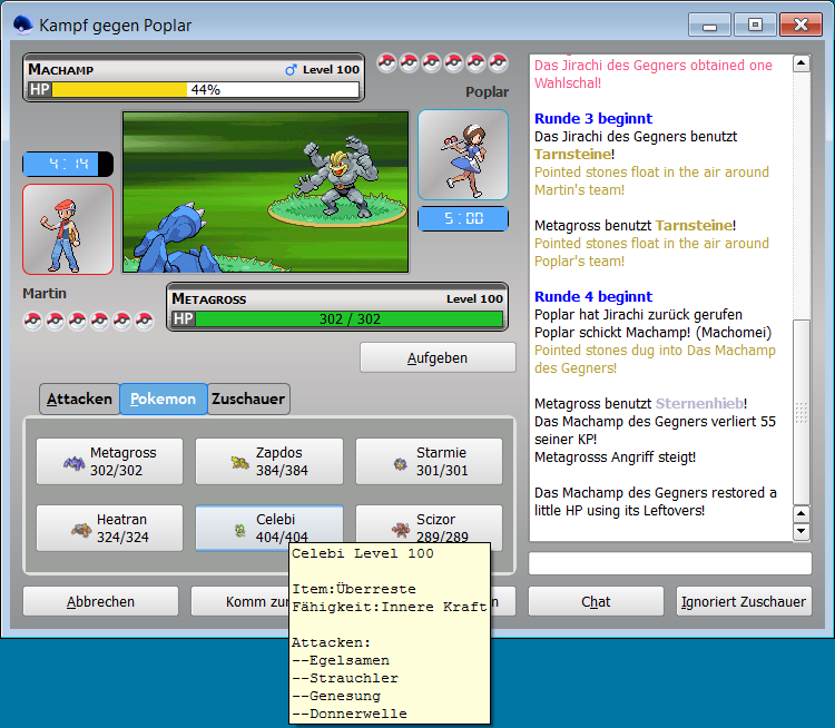Wenn du das Pokémon wechseln möchtest, siehst du dein Team und die KPs aller Pokémon. Auch hier kannst du mit der Maus darüberfahren, um das Level, das Item, die Charakteristik und die beherrschten Attacken zu sehen.