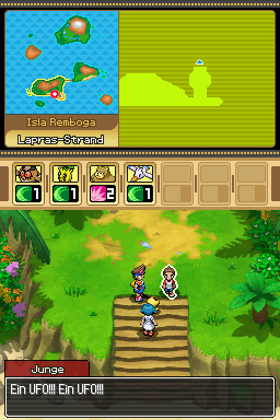Daher führt der Weg über die Treppe, die sich rechts beim Lapras-Strand befindet. Das Ende dieser Treppe erreicht, wird euch ein Junge entgegen rennen und panisch von einem "Ufo" schreien. Du kannst dir sicherlich denken, wer und was dahinter steckt! Also lauf mit Nema ins nächste Gebiet, die Krümmbucht, und besiege die Pokénapper mit ihrem Plinfa und ihrem Evoli!