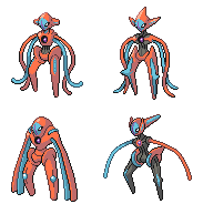 | #386 | ![]() | Deoxys | ![]() | Deoxys ist ein legendäres Pokémon aus der dritten Generation. Es hat insgesamt vier verschiedene Formen, die Angriffs-Form, die Verteidigungs-Form, die Initative-Form und die Normal-Form. In der dritten Generation bekam man je nach Editon ein Deoxys in einer bestimmten Form. Diese Form konnte man jedoch nicht ändern, außer man hat es auf eine andere Edition getauscht. Ab der vierten Generation änderte sich das; man kann in jeder Edition eine beliebige Deoxys-Form hervorrufen, wenn man sich in Schleide zu einem der vier Meteoriten stellt und diesen anklickt. Jeder von ihnen ruft eine andere Form hervor. Um die Formen in der fünften Generation zu ändern, geht man einfach in das Museum von Septerna City und spricht dort den Meteoriten an. | -- |