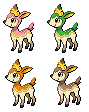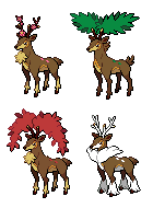 | #586 | ![]() ![]() | Kronjuwild | ![]() | Kronjuwild ist ein Pokémon aus der fünften Generation. Für es gelten die selben Bedingungen wie für Sesokitz. Jedoch ändert es nicht nur seine Farbe, sondern auch sein Aussehen. Beispielsweise bekommt es im Winter ein weißes Fell und im Sommer Blüten auf dem Geweih. | Drachenstiege |