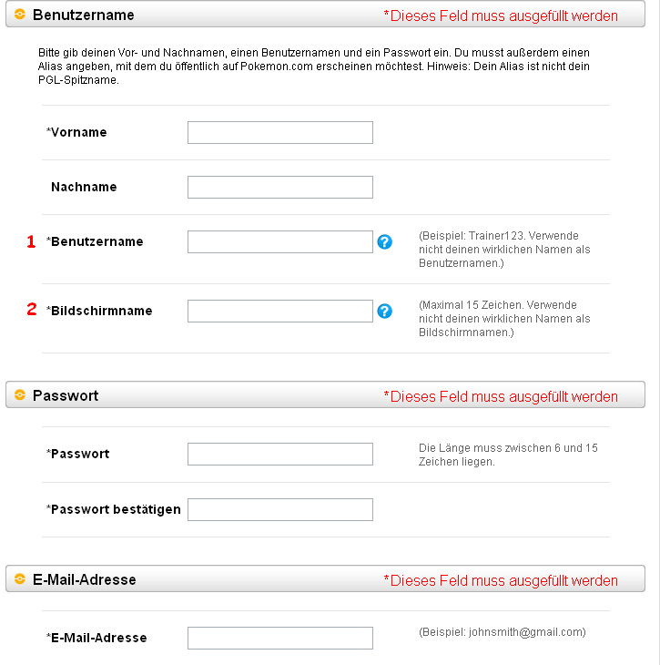 2) Der "Bildschirmname" wird im Pokémon Trainer Club angezeigt, wenn du dich angemeldet hast. Er darf identisch sein mit dem Benutzernamen.