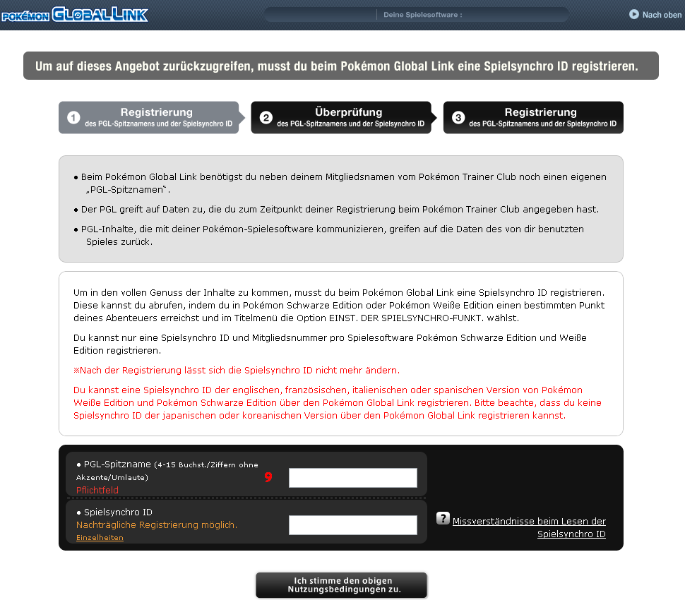6) Dies sind die Nutzungsbedingungen der Webseite des Pokemon Global Link (http://de.pokemon-gl.com/), von der aus du später Zugriff zur Traumwelt haben wirst. Auch hier ist ein Häkchen zu setzen, um sich registrieren zu können.