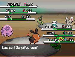 Die klassischen 1-gegen-1-Kämpfe bleiben auch in den Editionen Schwarz und Weiß erhalten. Bei den Einzelkämpfen schicken die Trainer jeweils ein Pokémon in den Kampf, um es gegen ein anderes antreten zu lassen - sei es nun ein Wildes oder das eines anderen Trainers. Ist das Pokémon besiegt, so kann es gegen das nächste Pokémon im Team ausgetauscht werden.![]() |
